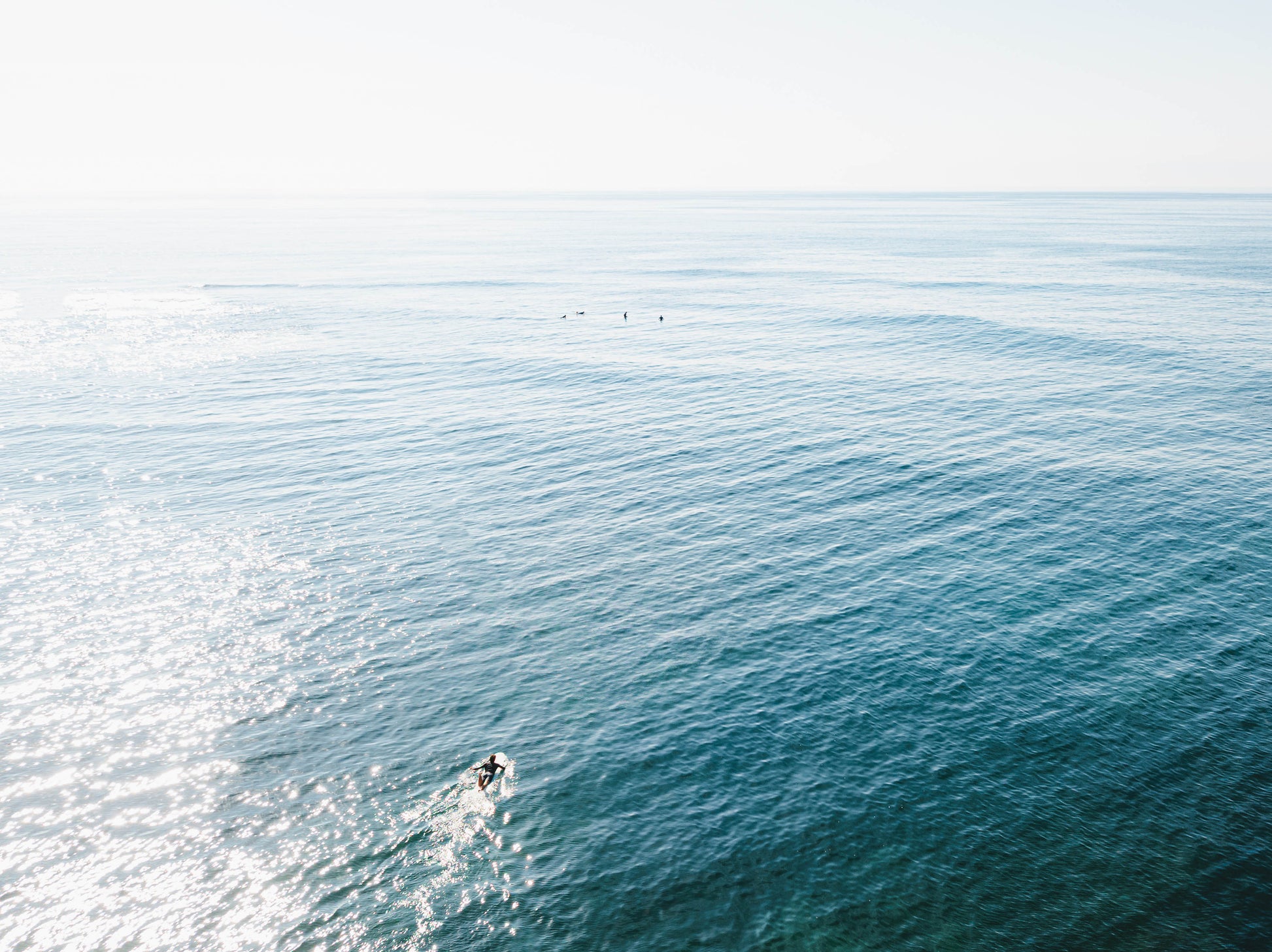 The soft morning light dances across the surface, creating gentle highlights that contrast against the deeper teal tones below. The composition is expansive and uncluttered, celebrating space, scale and the simple ritual of paddling out.