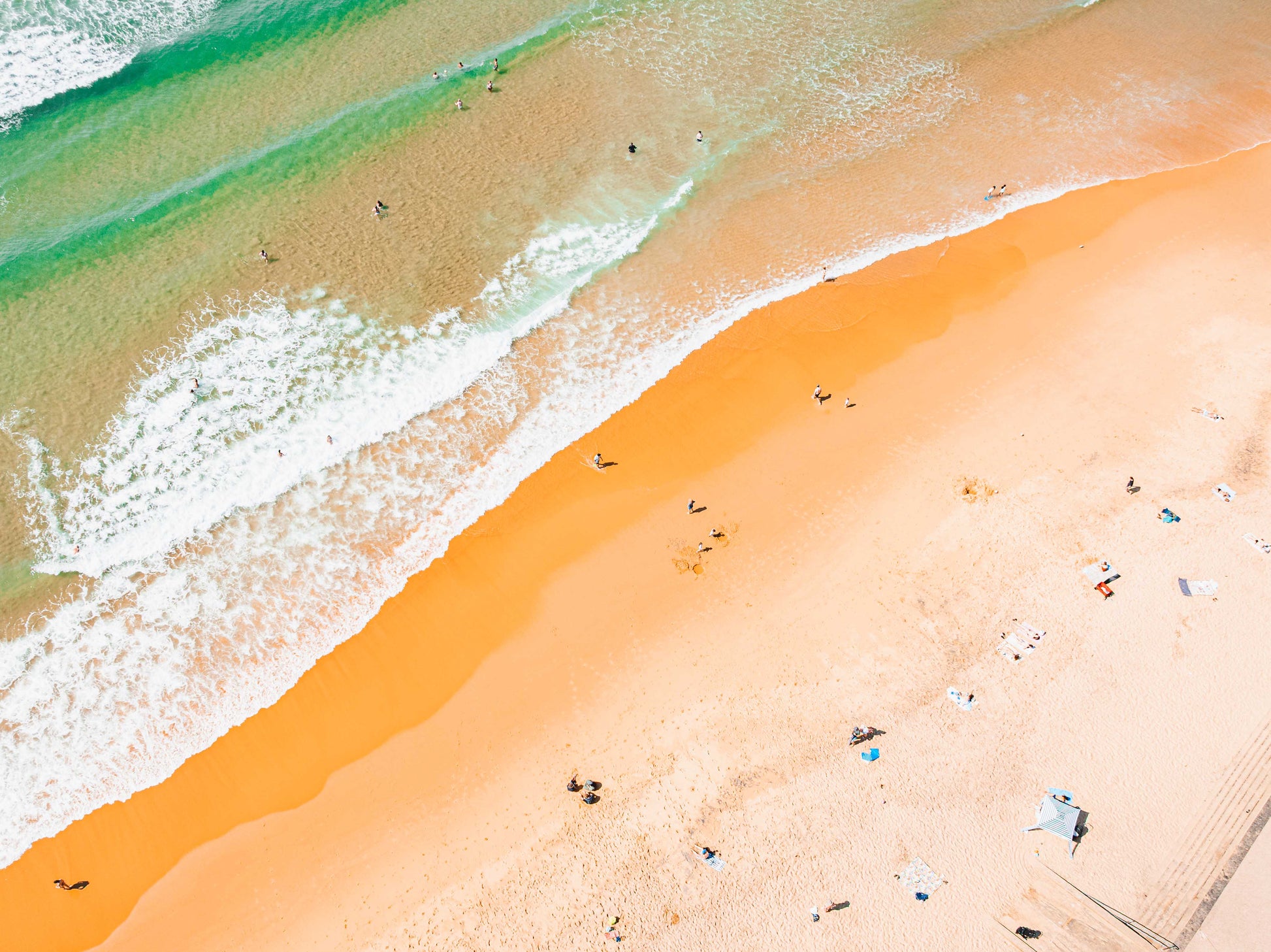 From this aerial perspective, the coastline becomes beautifully graphic. The soft curve of white wash traces the edge of the beach, while swimmers and sun-seekers appear scattered like small, fleeting moments across the sand. The ocean shifts from deep green to pale aqua, revealing subtle sandbanks beneath the surface.