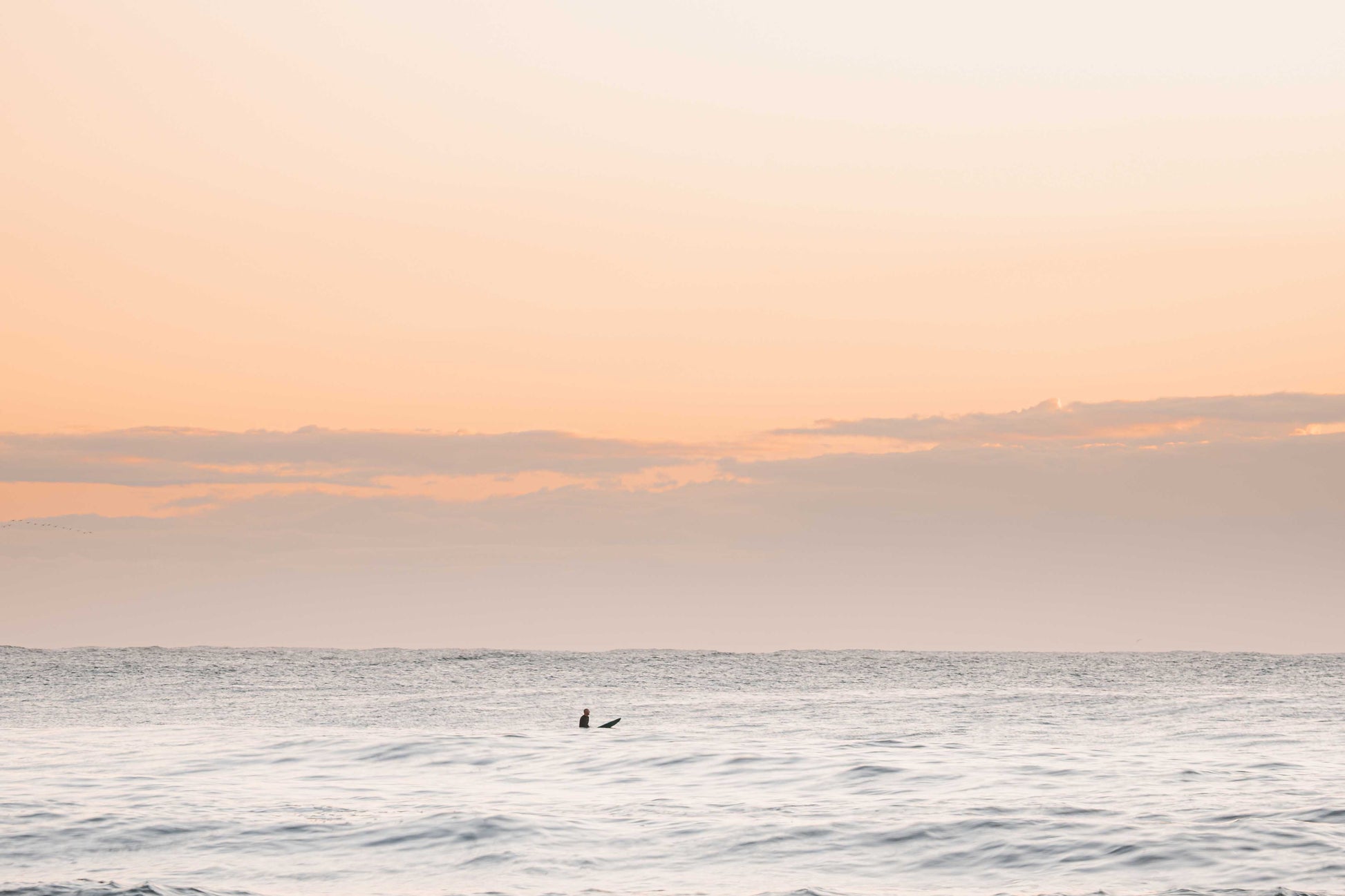 Sunriser captures a quiet, reflective moment off Avoca Beach on the NSW Central Coast. As the early morning sky glows with soft peach and golden tones, a lone surfer waits patiently beyond the breaking waves, silhouetted against the calm horizon.